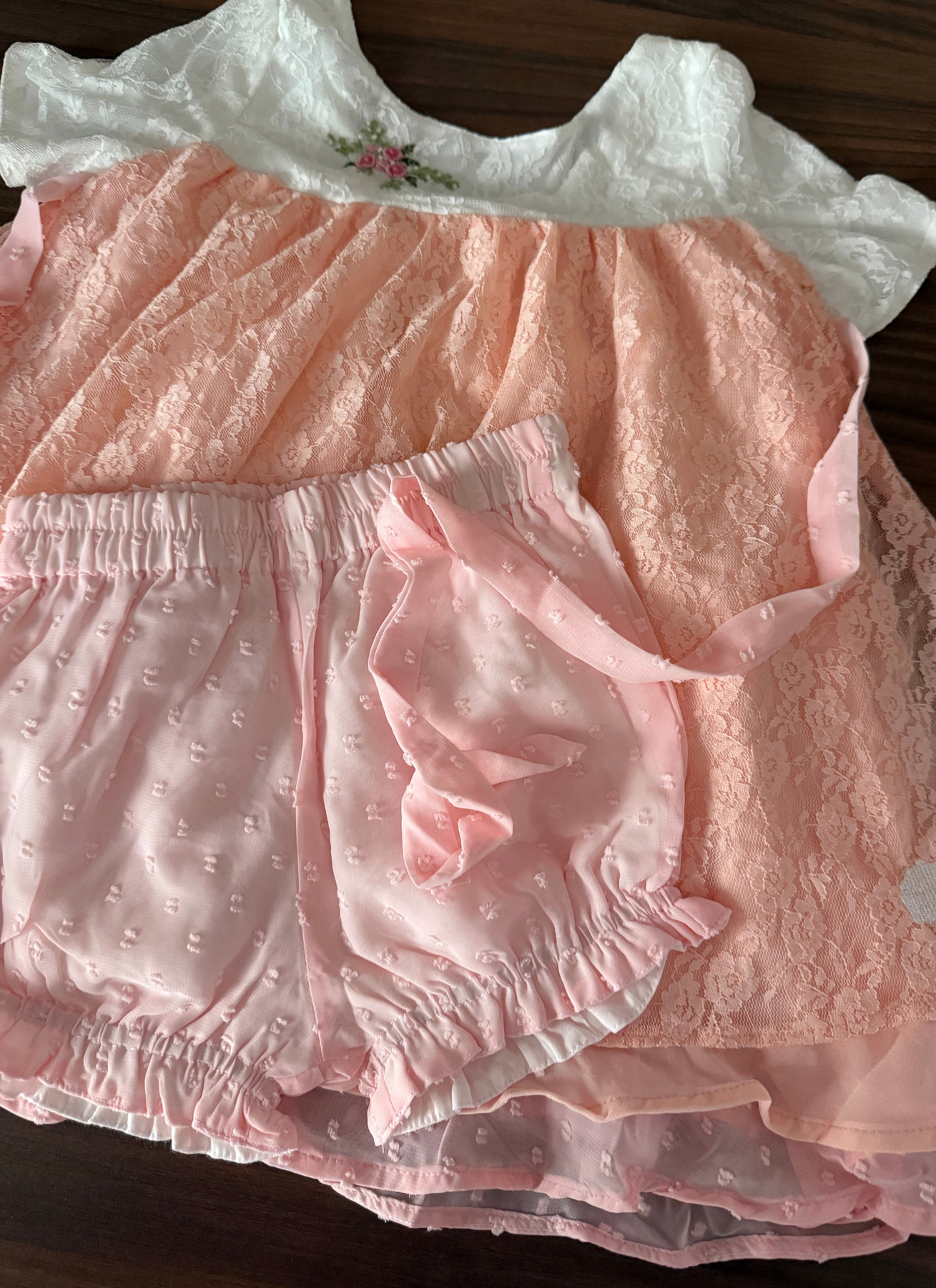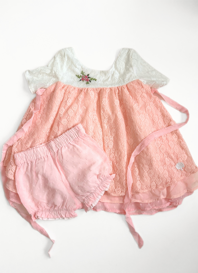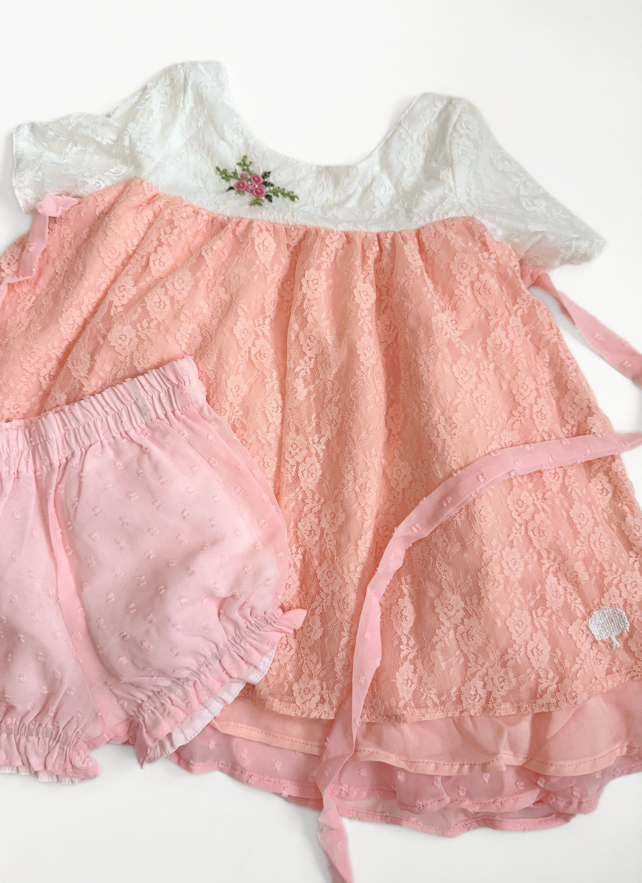 LAST Roots Dress Set :: Lace + Clip Dot Floral Embroidered - all sizes include bloom style bottoms. No stretch in these fabrics but bottoms do have elastic in waist. Scoop back, sash tie on back of tunic, 4 layers of skirt!