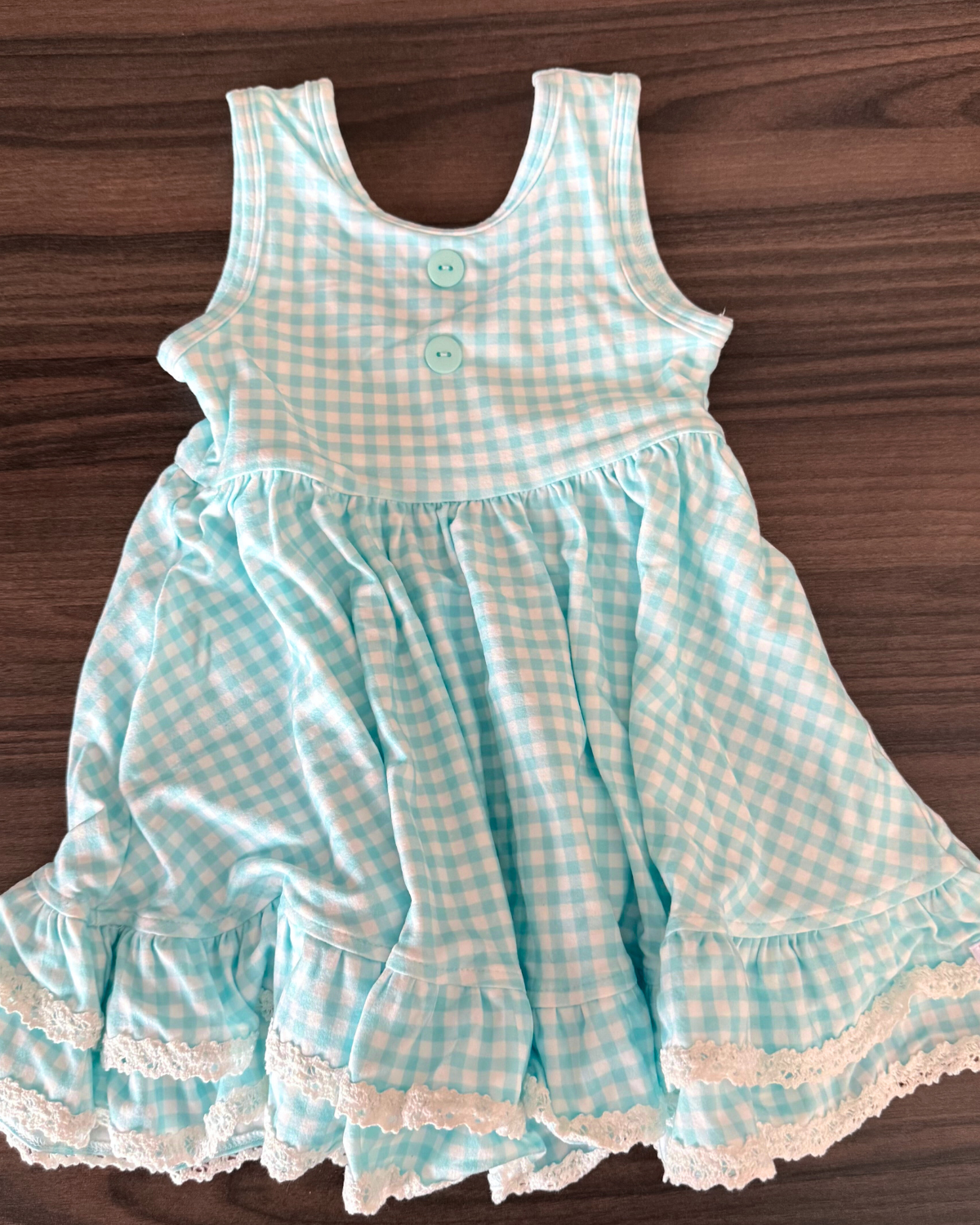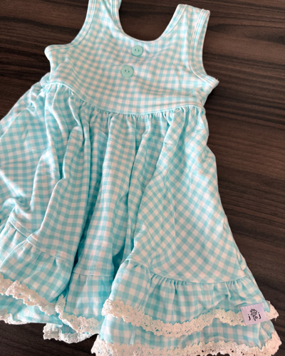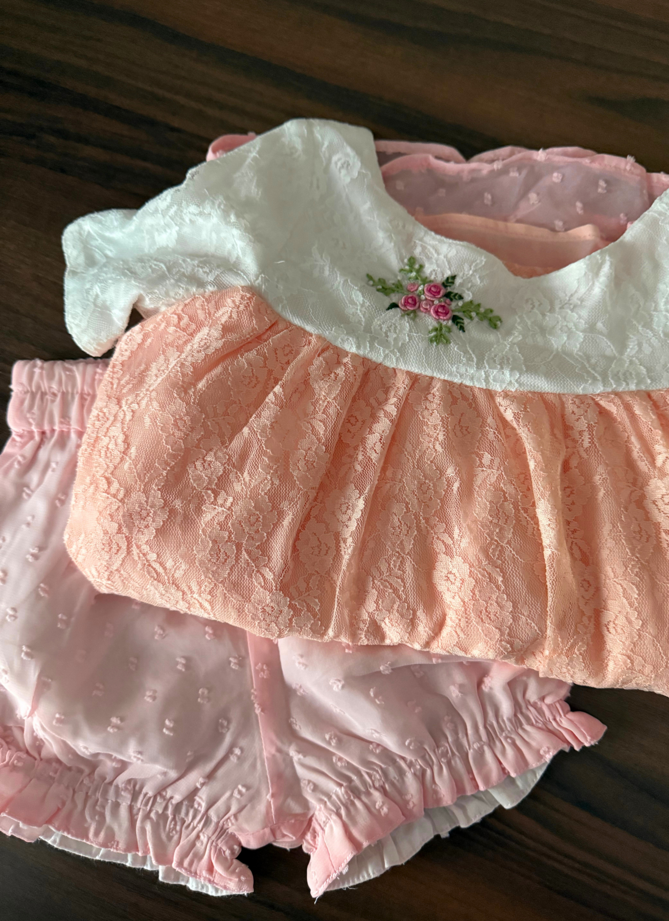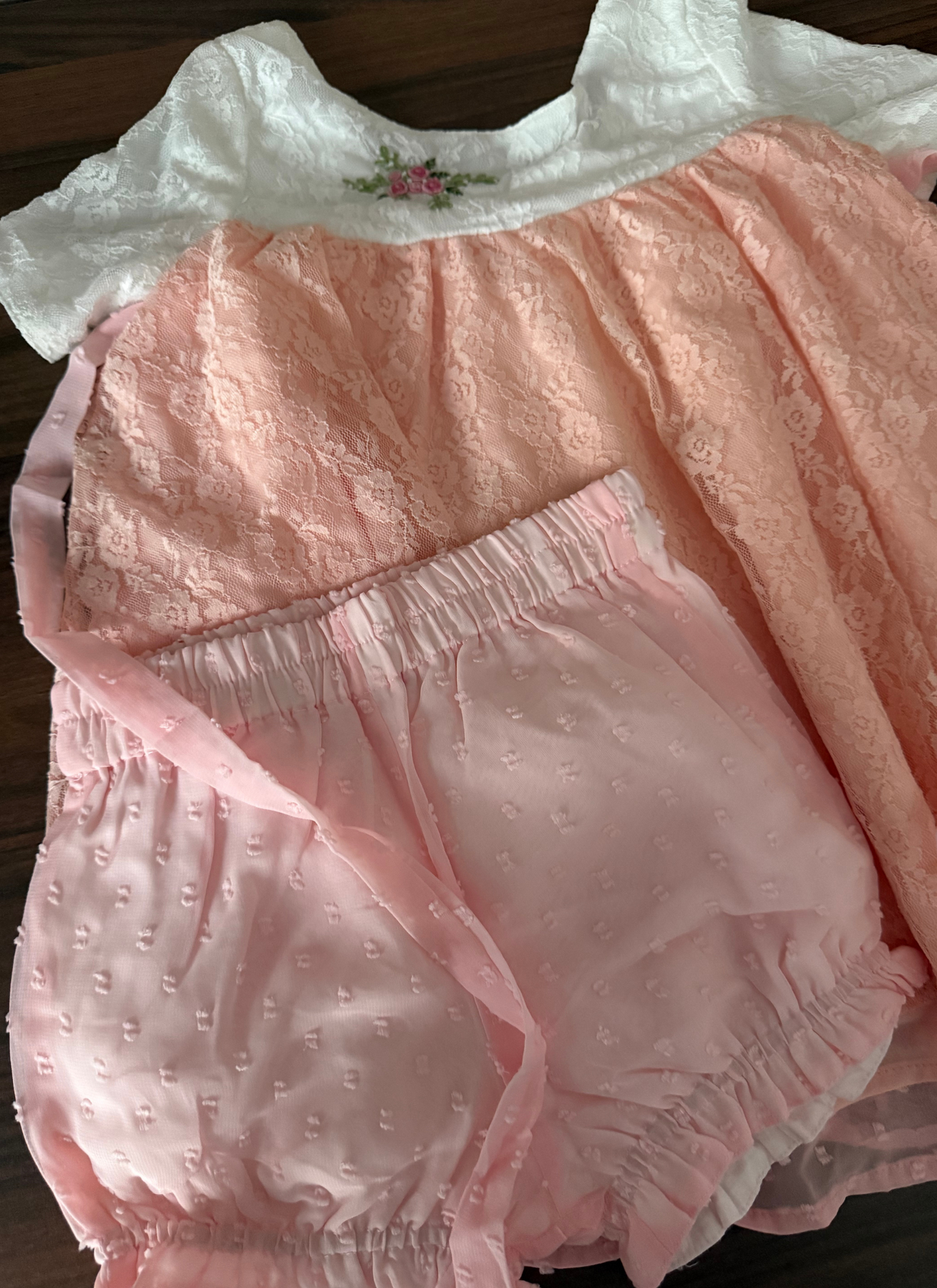 LAST Roots Dress Set :: Lace + Clip Dot Floral Embroidered - all sizes include bloom style bottoms. No stretch in these fabrics but bottoms do have elastic in waist. Scoop back, sash tie on back of tunic, 4 layers of skirt!