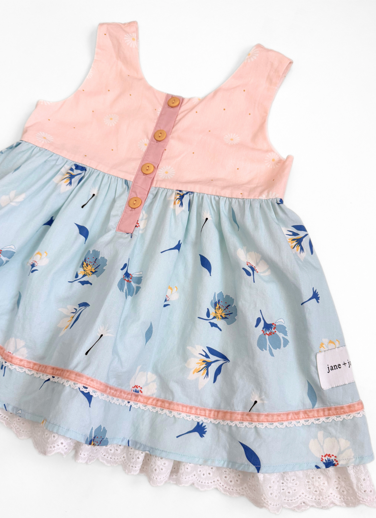 Style :: OOAK Lainey Tunic Top (Woven Cotton) :: Petals + Blooms (8Y) woven cotton tunic top with working button placket, custom dyed buttons, velvet trim with lace detail, eyelet ruffle hem. Tunic is approx 13" wide in chest and 20.5" from shoulder to hem.
