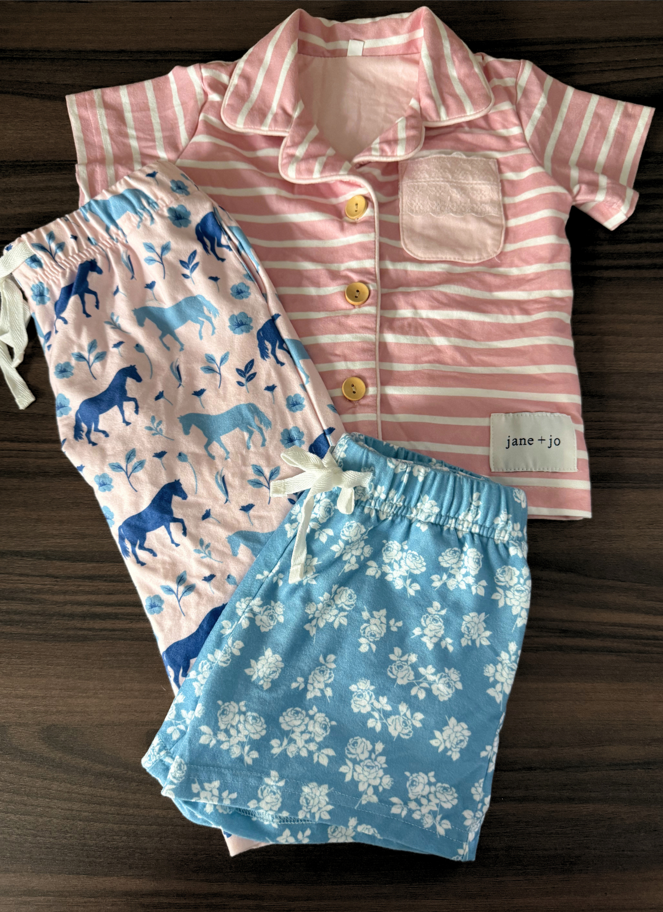 Regular price $18.00LAST 3PC Lounge Set :: Wild Horses (12/18M) tagged 12M but will fit 12/18M size. One button up top + 2 coordinating bottoms (shorts + lounge pants).Minor fabric imperfections. May or may not have hang tags.