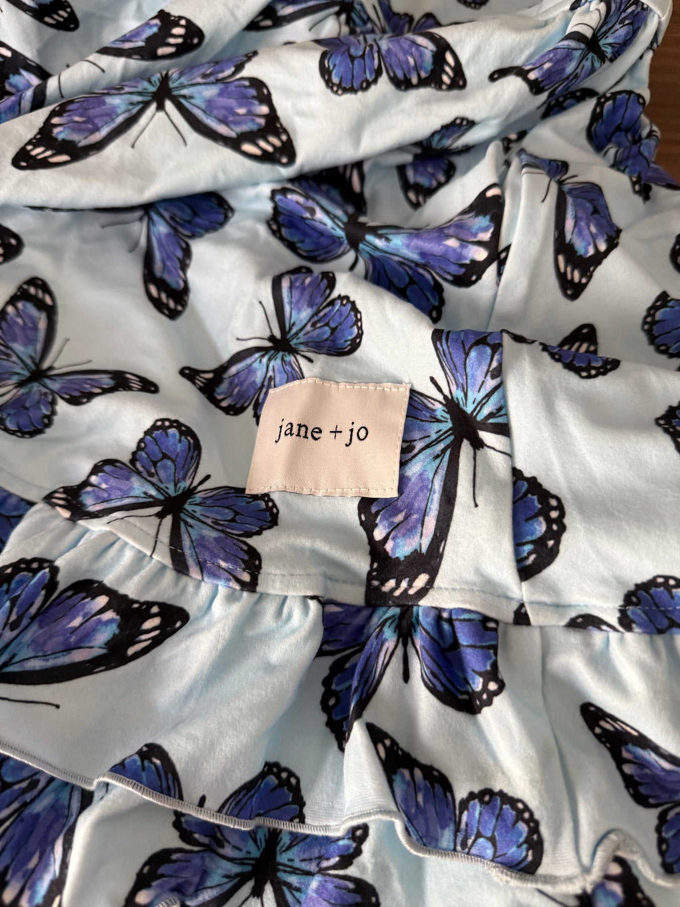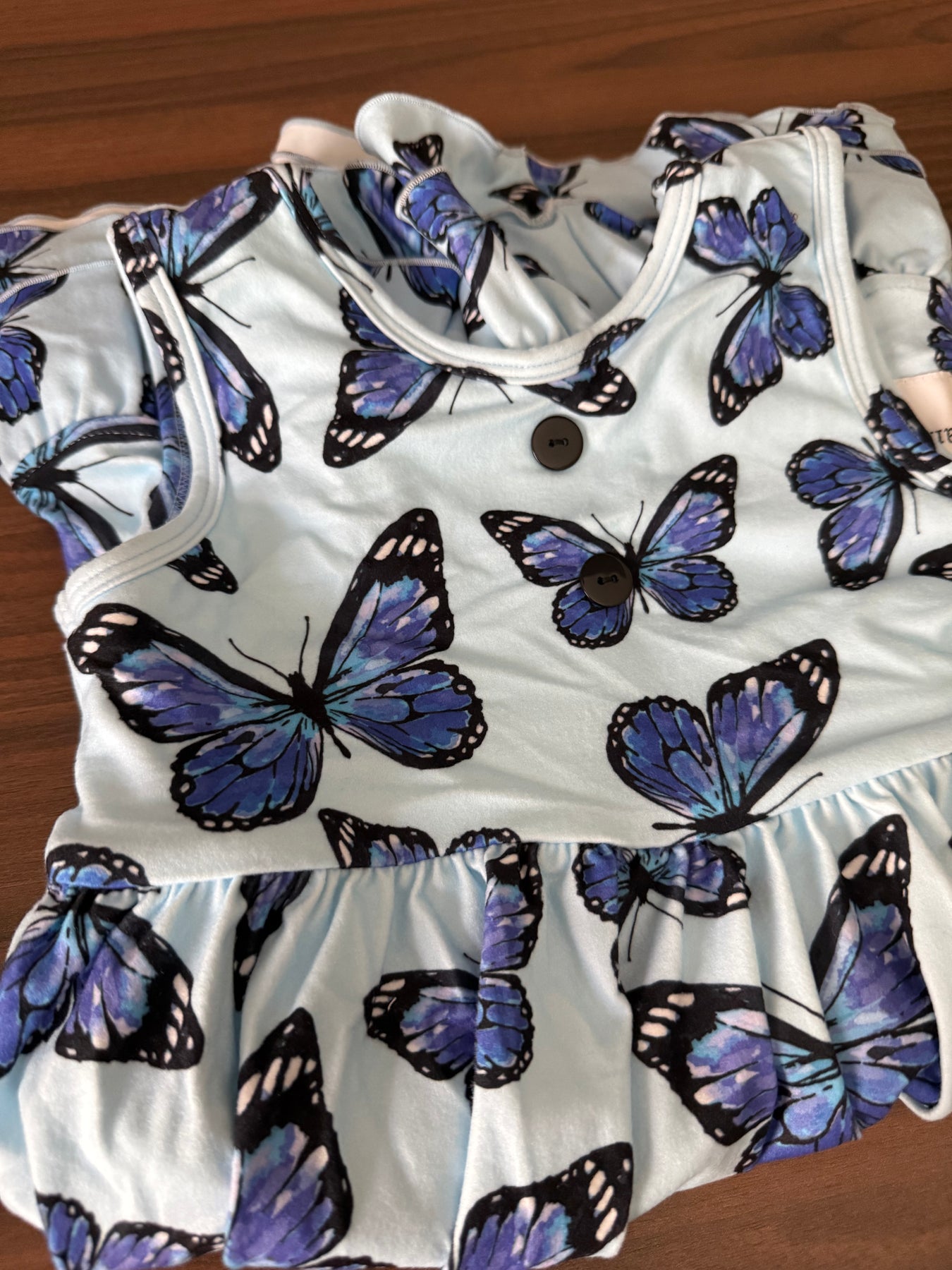 LAST House Dress :: Blue Monarchs (5Y) small mark on ruffle hem not noticeable really and stitching on small area of back bias is alittle off the seam.