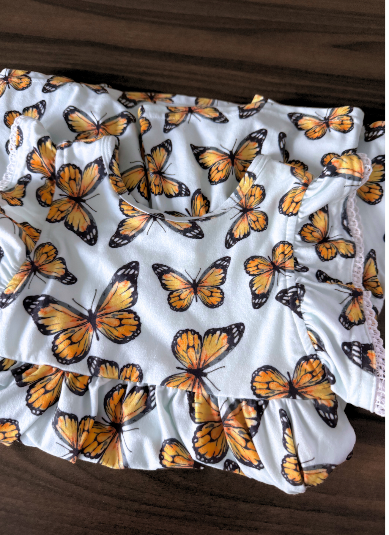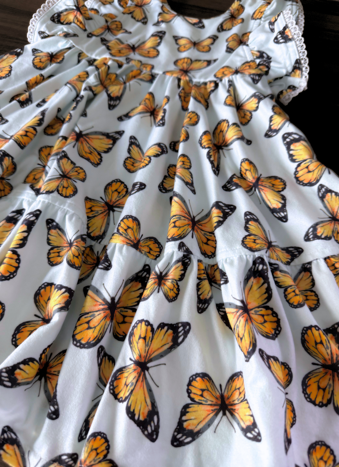Regular price $16.00LAST Tiered Day Dress :: Monarchs Light Blue Background (4T) minor marks on dress