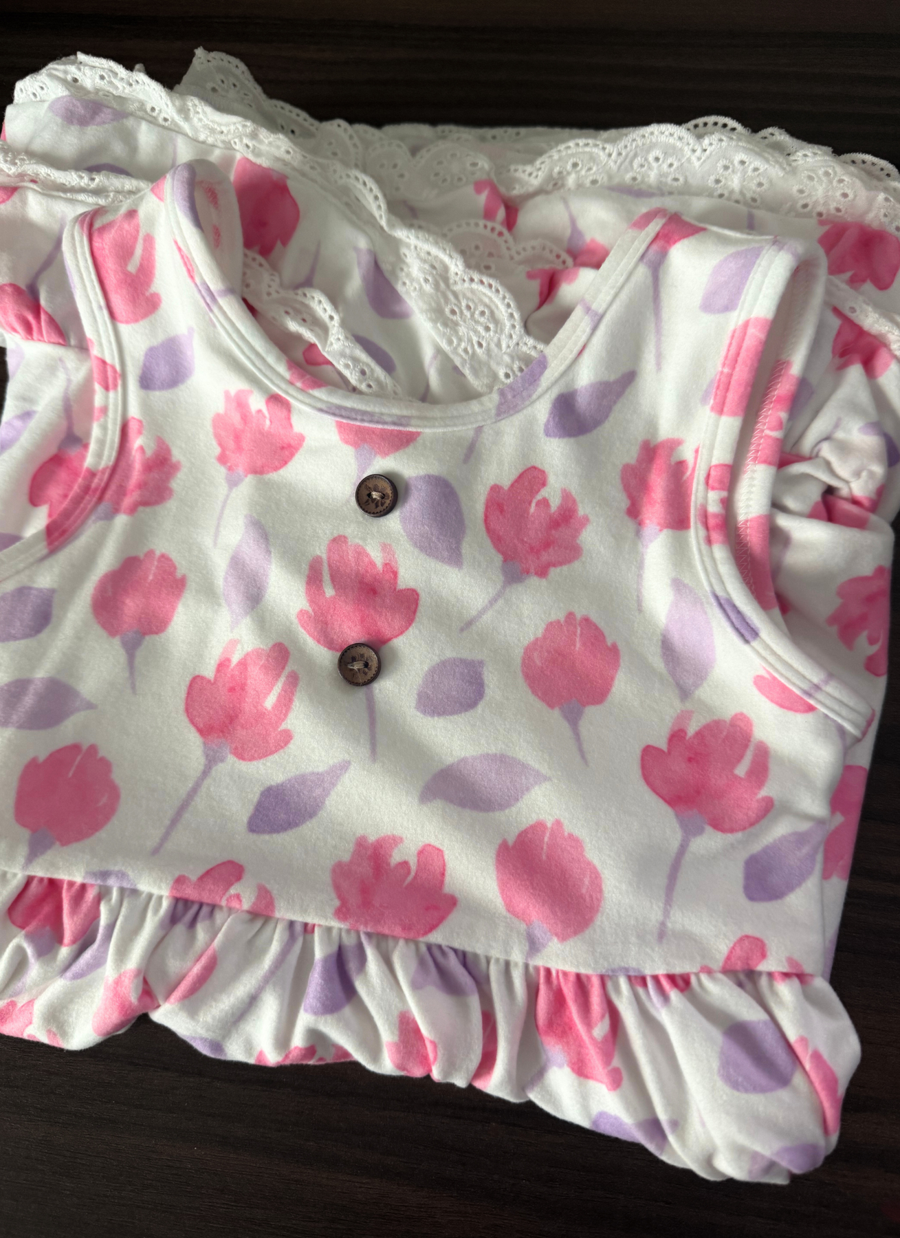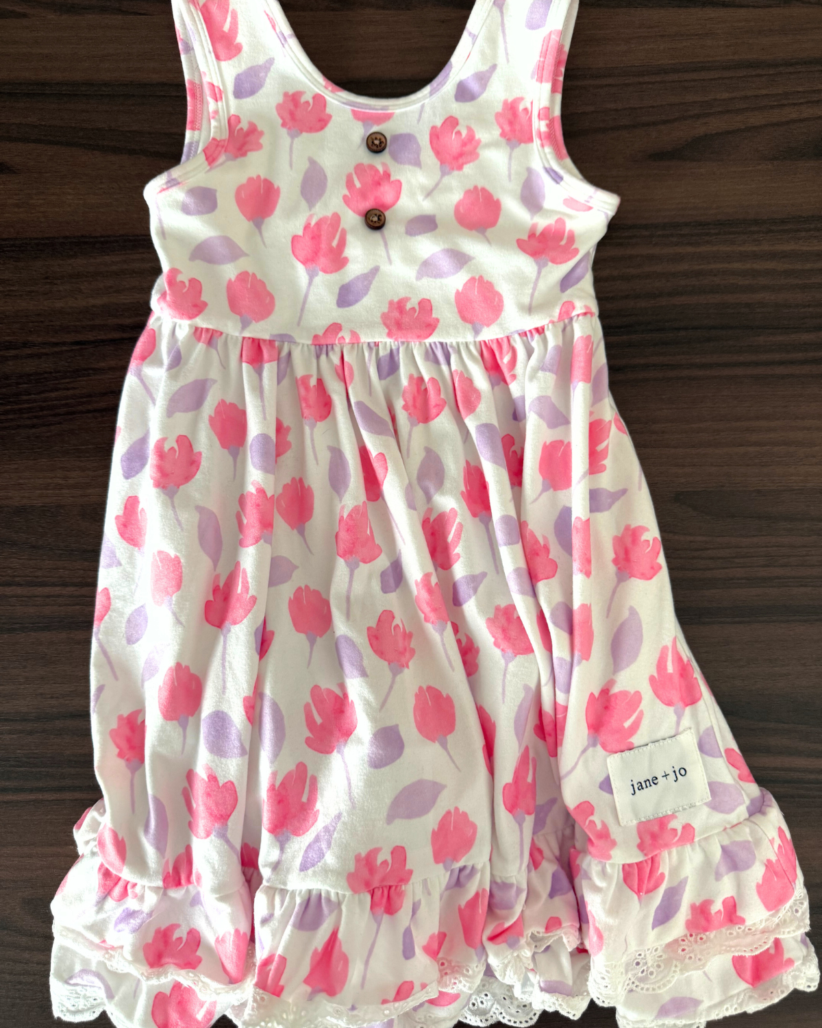 Regular price $18.00Style :: OOAK House Dress :: Spritzey Floral (4T) a few fabric imperfections from being light colored.