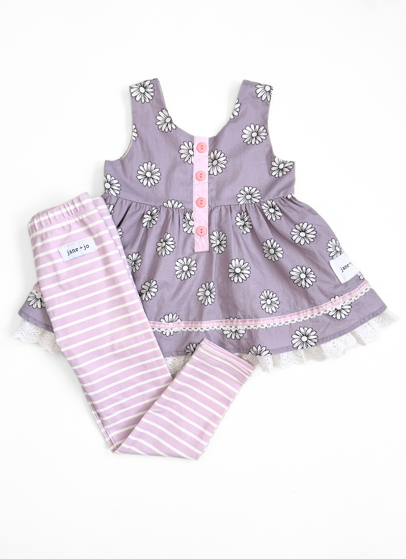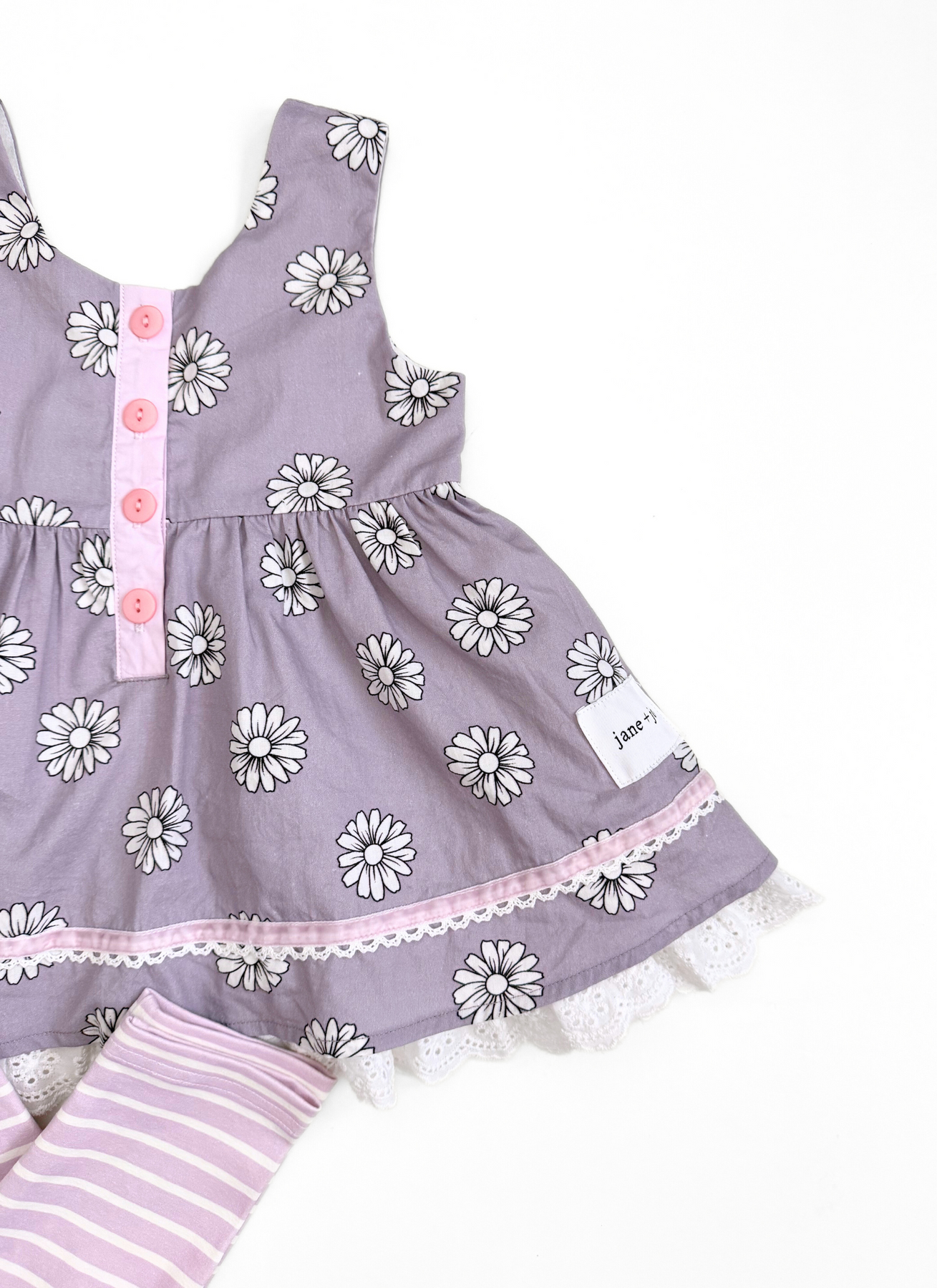 OOAK Lainey Tunic Set (Woven + Knit Cotton) :: Dusty Purple Daisies + Stripes (4T)
