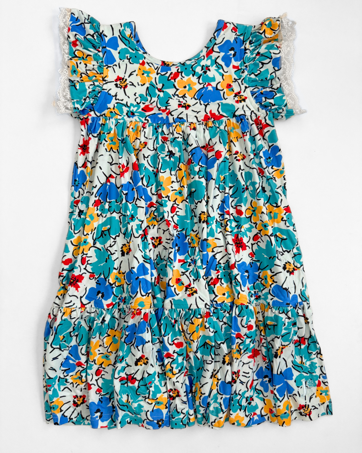 Style :: OOAK Tiered Day Dress ::  Back To School Blooms. (8Y) hidden pockets, flutter sleeve with lace detail, doube lined chest