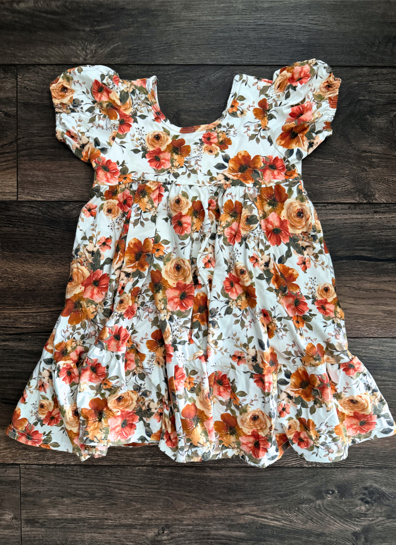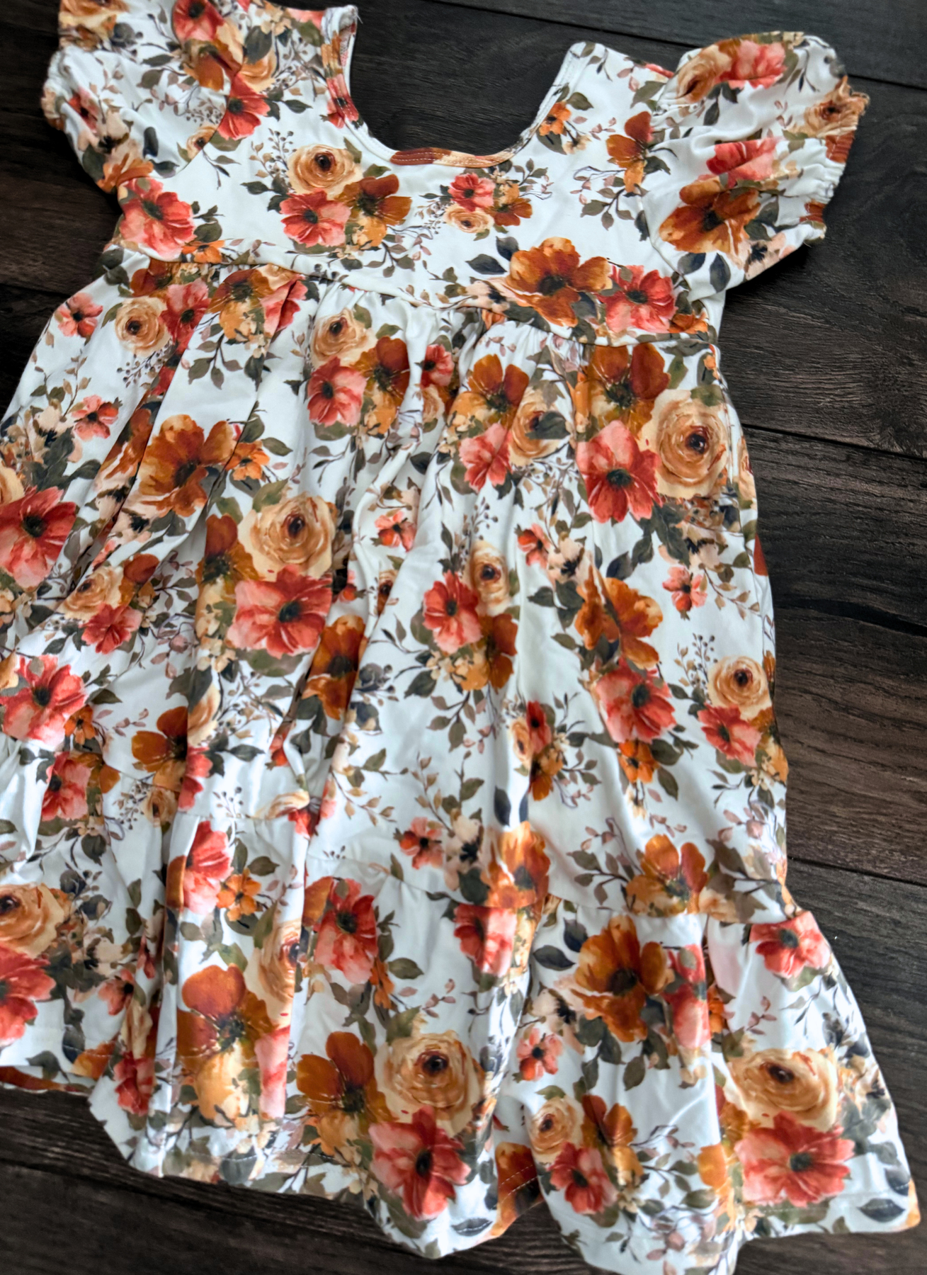 Style :: OOAK Tiered Viv Dress:: Fall Florals (3T/4T) this one is different then the bulk viv fall florals dress we made in the past which featured a small ruffle hem and tie back closure etc. This OOAK one is a more flowing fit with a scoop back, puff sleeves, and wide tiered hem. AMAZING twirl factor! It is tagged 3T but these do run large so it will definitely work for a 4T size. Heavy to ship!