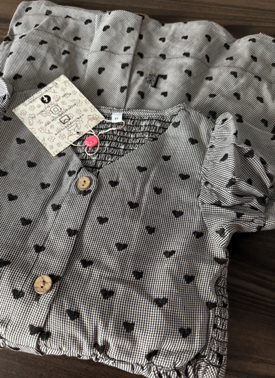 Style :: OOAK Lainey Tunic Top (Woven Cotton) :: Petals + Blooms (8Y) woven cotton tunic top with working button placket, custom dyed buttons, velvet trim with lace detail, eyelet ruffle hem. Tunic is approx 13" wide in chest and 20.5" from shoulder to hem.