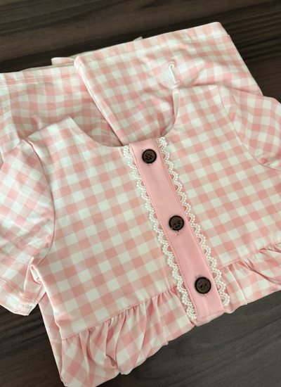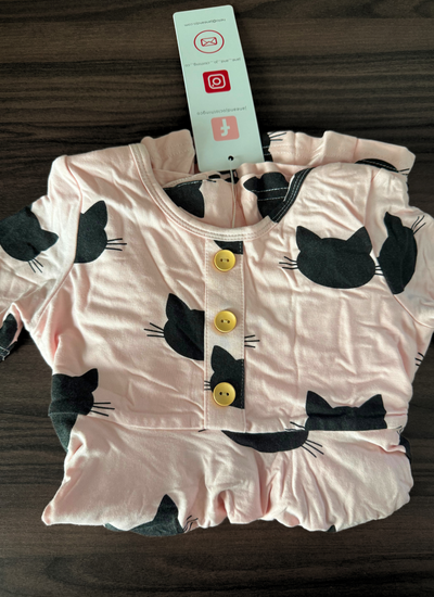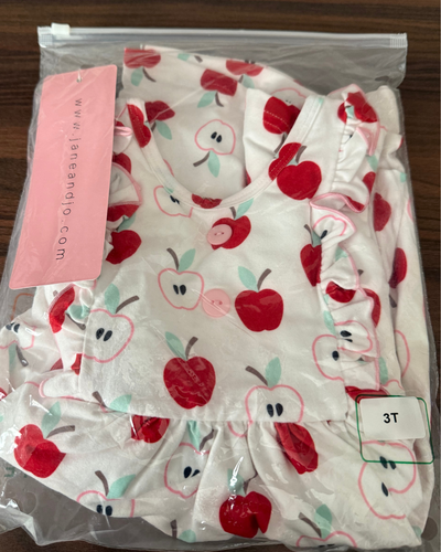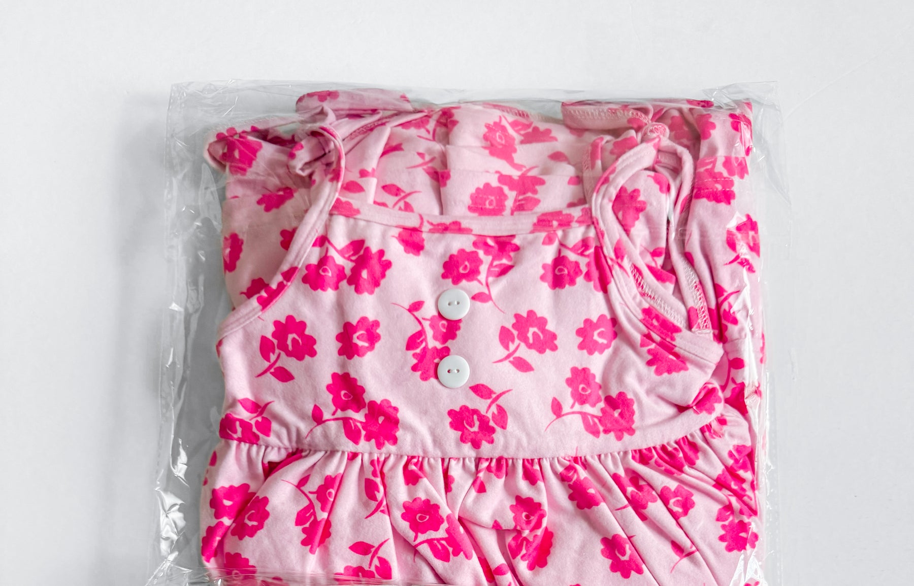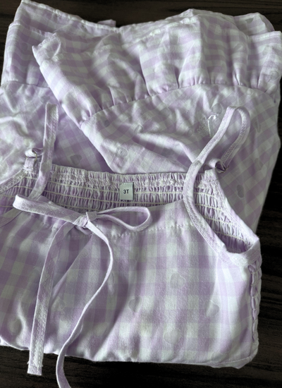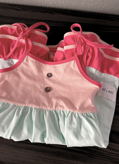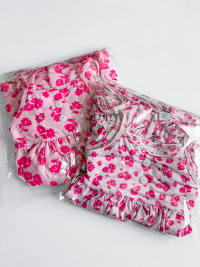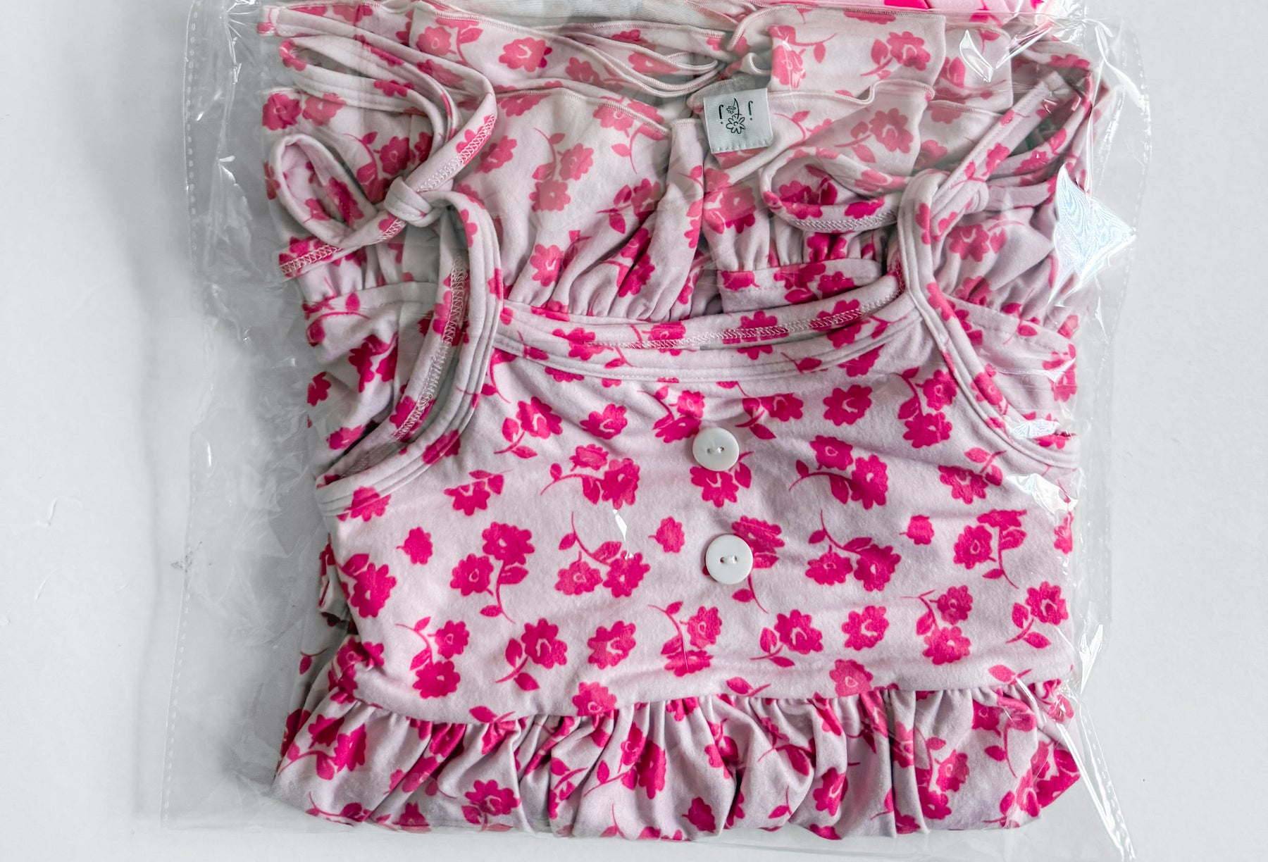 LAST House Dress :: Ditsy Pink Floral (3T) - one was printed in a darker magenta colorway on a lighter lilac background in a smaller scale print and the other was printed in a brighter hot pink colorway on a more pinky background in a larger scale print (choose below, there is only one of each).