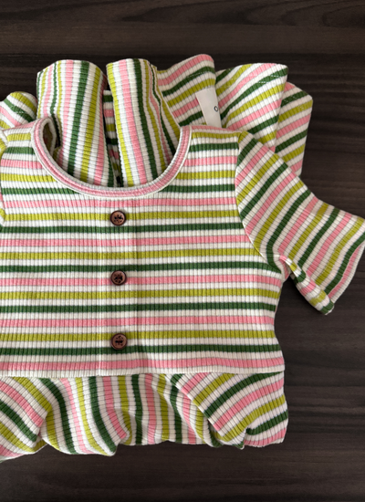 Style :: OOAK 1PC Skirted Swimsuit :: Happy Day Floral (4T) tie over shoulders, the behind area was constructed alittle too narrow, so slim bootie approved - if of average build you may find not enough coverage in the behind area.